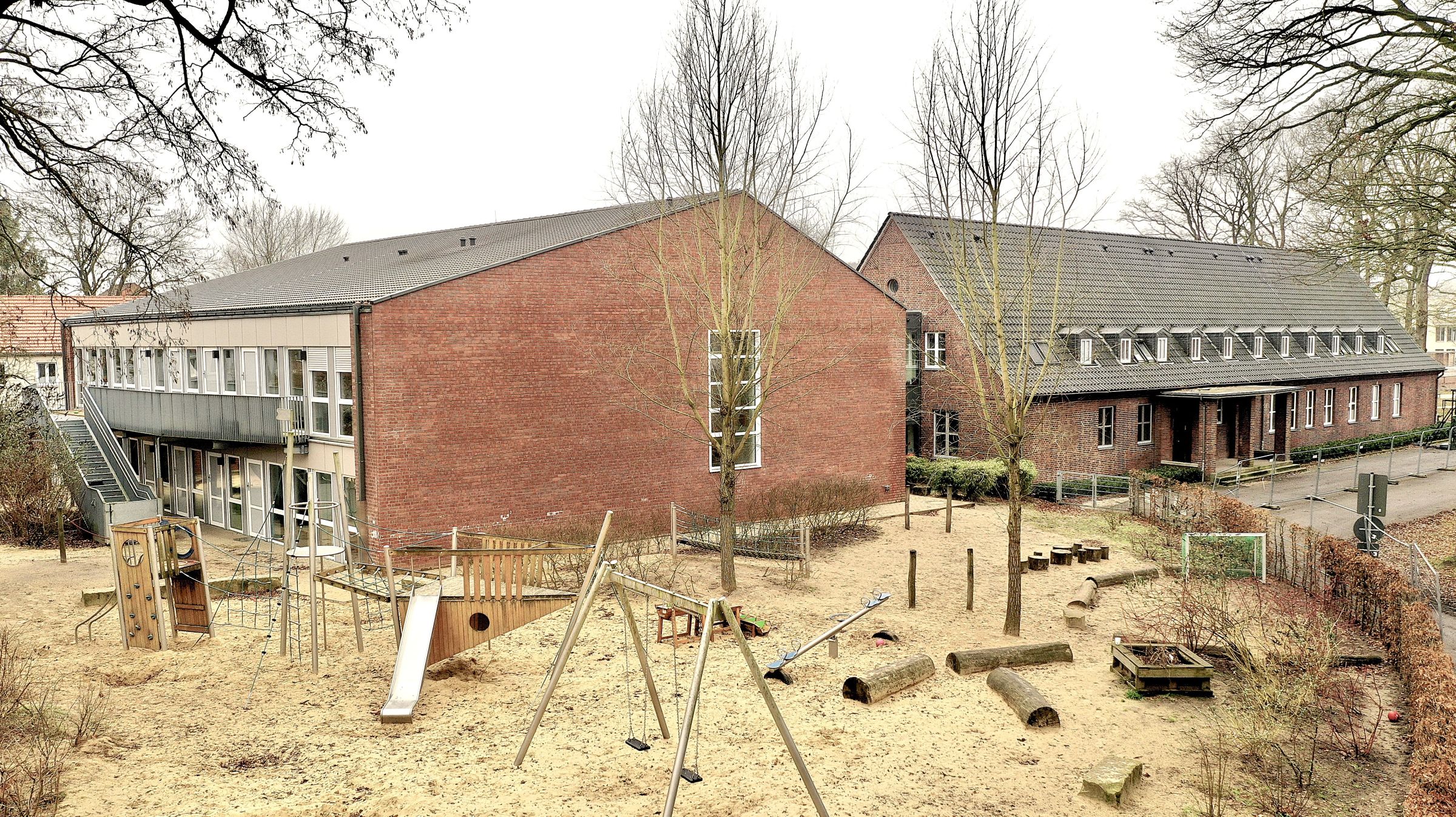 Der neu erstellte Kita-Anbau wurde durch einen voll verglasten Verbindungstrakt mit dem Bestandsgebäude verbunden.