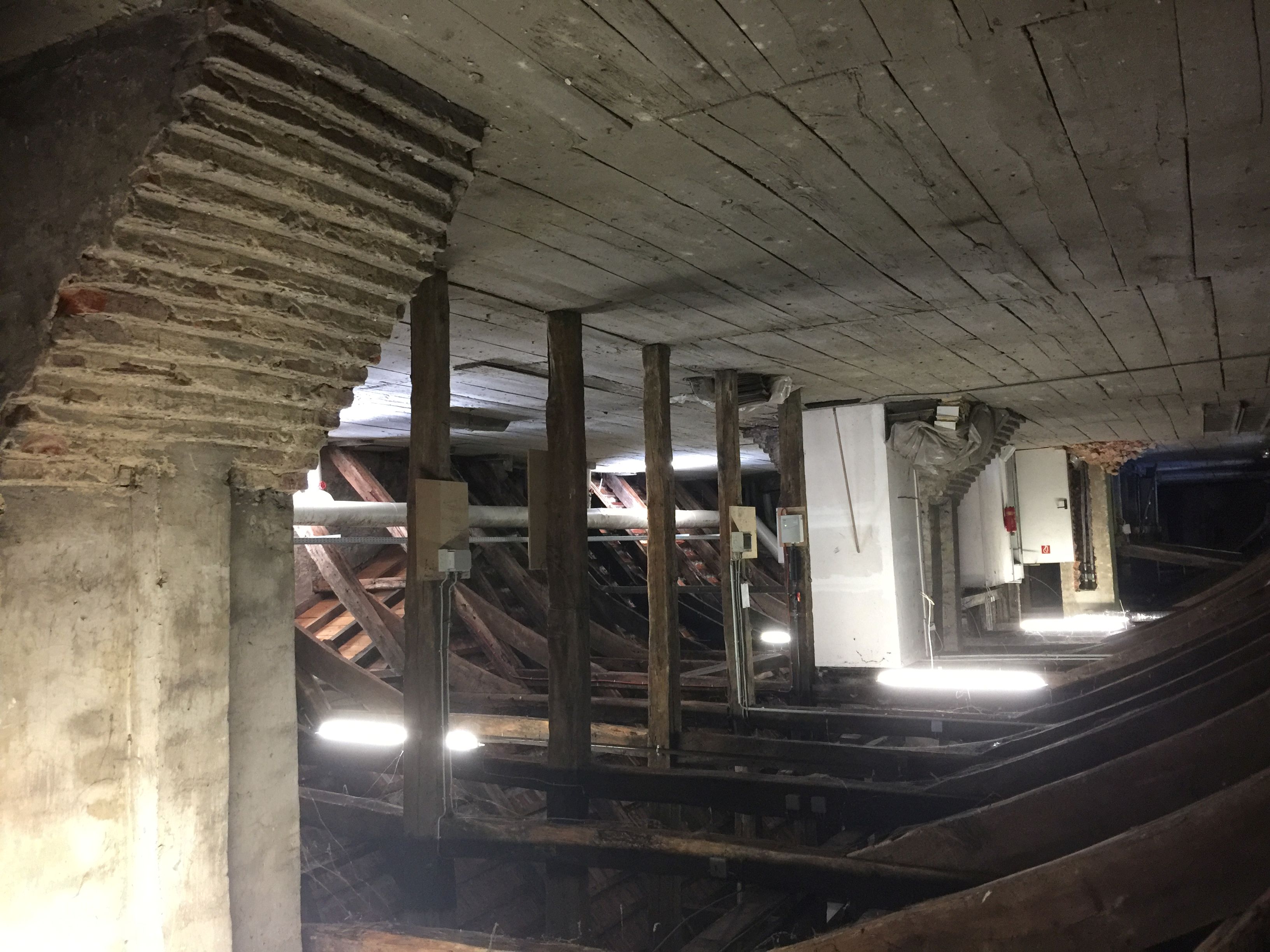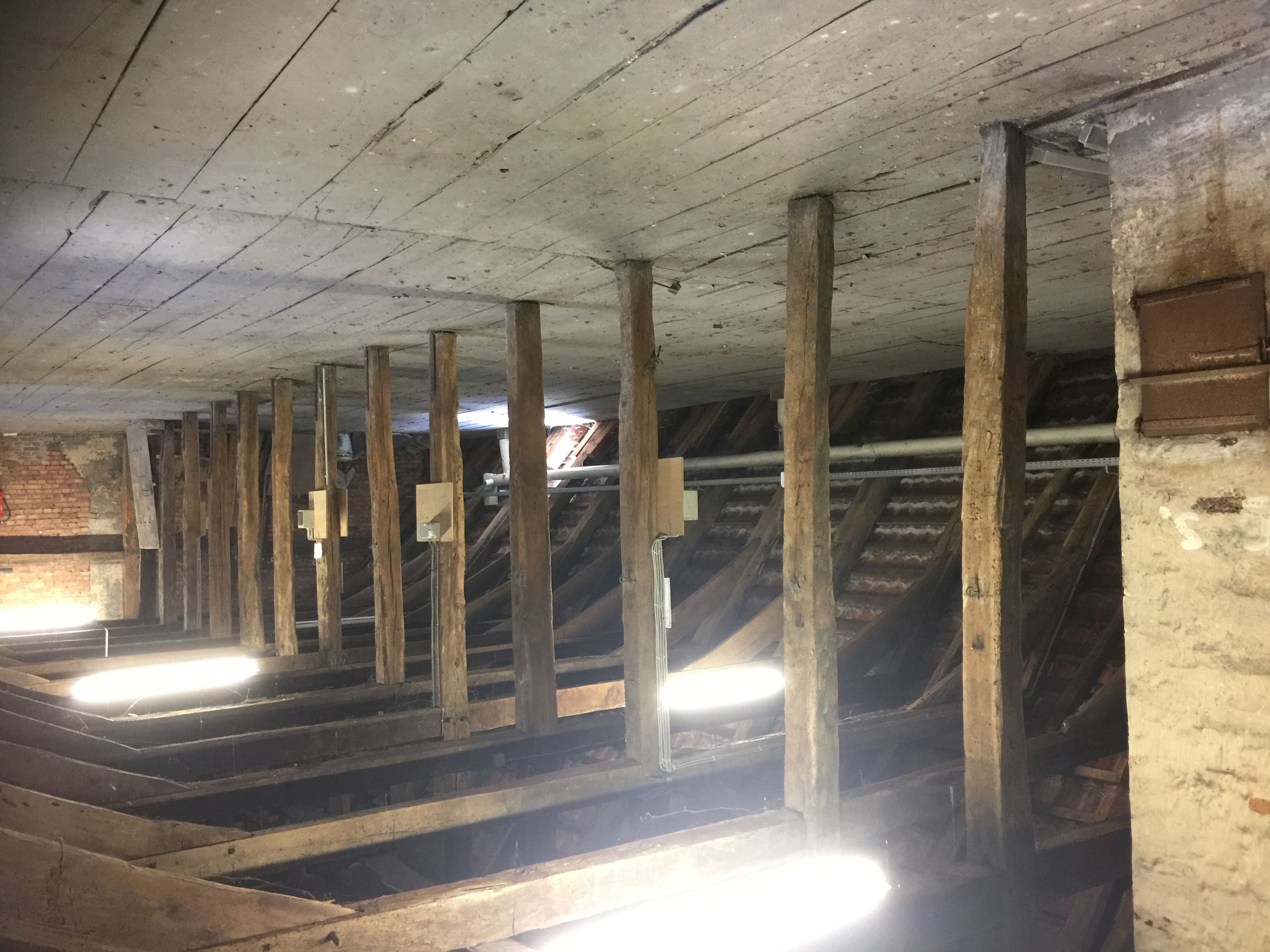 Für diesen Umbau wurden die historischen Holzbalkendecken über alle Geschosse geöffnet und das Dachtragwerk