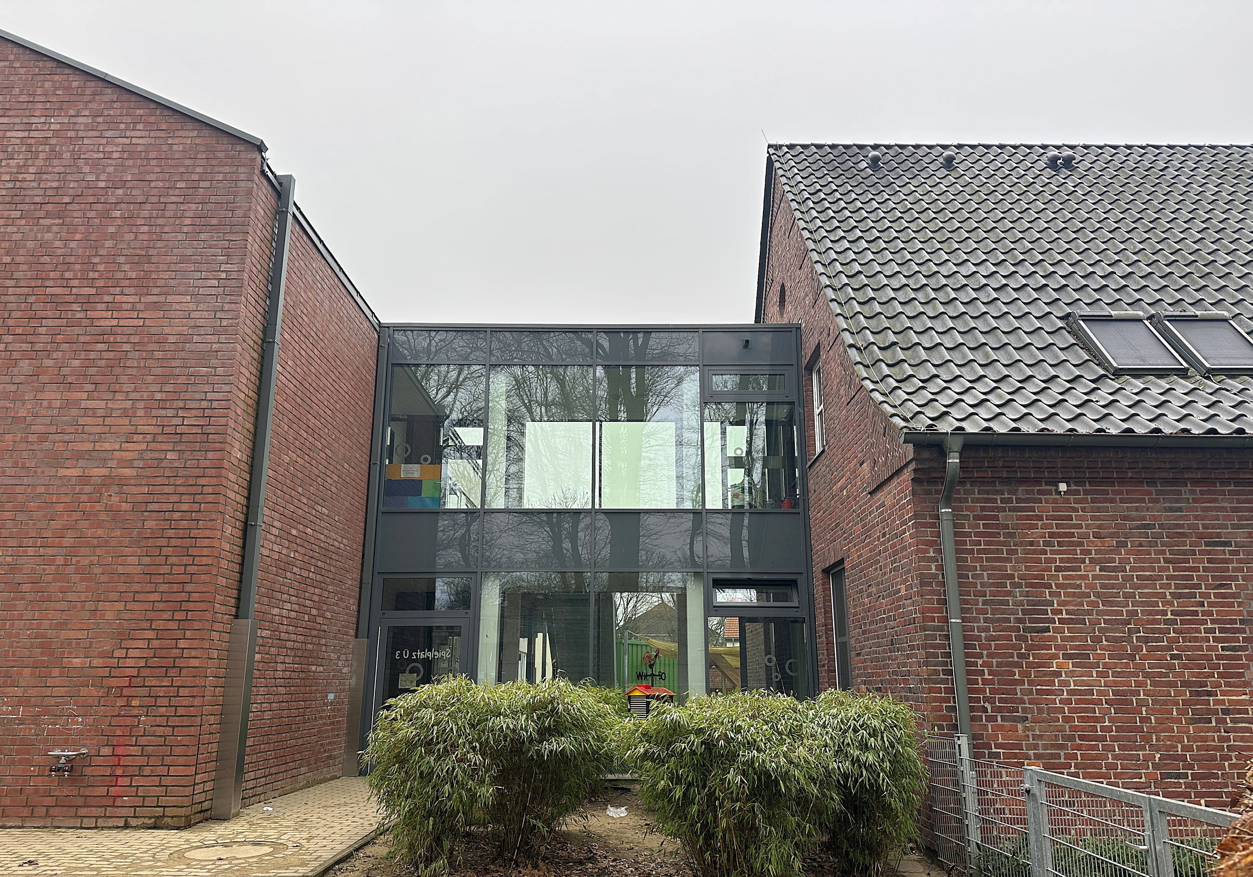 Der neu erstellte Kita-Anbau wurde durch einen voll verglasten Verbindungstrakt mit dem Bestandsgebäude verbunden.